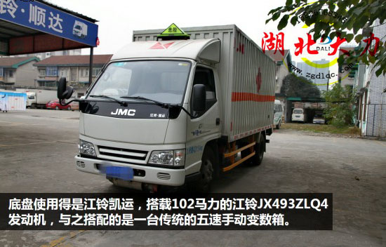 這里易燃液體廂式運(yùn)輸車的底盤采用的是江鈴凱運(yùn),搭載的是2.8排量的江鈴JX493ZLQ4發(fā)動(dòng)機(jī),最大扭矩輸出245牛米,最大輸出102馬力。與之搭配的是一款傳統(tǒng)的五速手動(dòng)變數(shù)箱,由于運(yùn)載的是危險(xiǎn)物品,運(yùn)行速度也不會(huì)很快,那么這樣的動(dòng)力配比是完全能滿足用戶需求的。