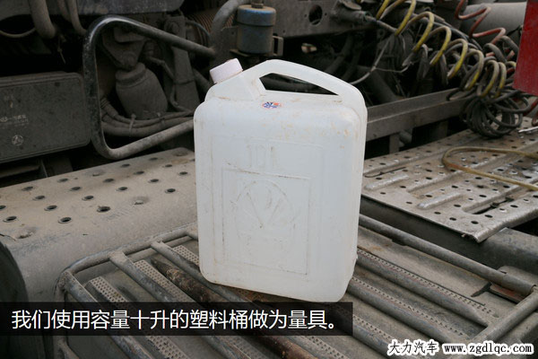 為了更直觀的進(jìn)行測試,我們選擇了一只容量為10升的塑料油桶作為容器,怠速運(yùn)行期間的燃料全部儲(chǔ)存在這里,可以把它理解為這輛卡車的一個(gè)油箱,只不過容量小一些而已。