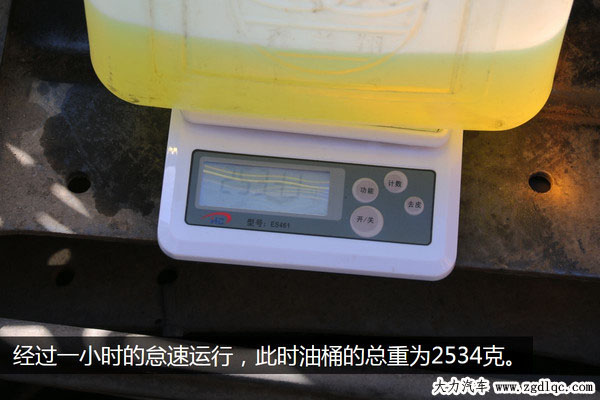 經(jīng)過稱重,此時(shí)的油桶總重為2534克,相比測試前減少了1624克,這一部分就是怠速一小時(shí)消耗的燃油量,但這只是重量數(shù)據(jù),要想得到體積數(shù)據(jù)還需要進(jìn)行一次計(jì)算。已知柴油的密度為0.85,通過密度計(jì)算,此次怠速油耗測試一共消耗了1.91升柴油。