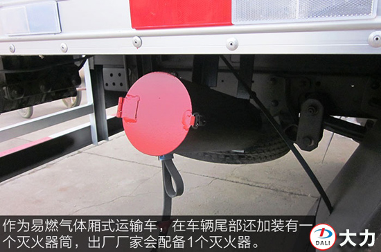 作為易燃?xì)怏w廂式運輸車,在車輛尾部還加裝有一個滅火器筒,出廠廠家會配備1個滅火器,發(fā)生緊急情況時可救急使用。