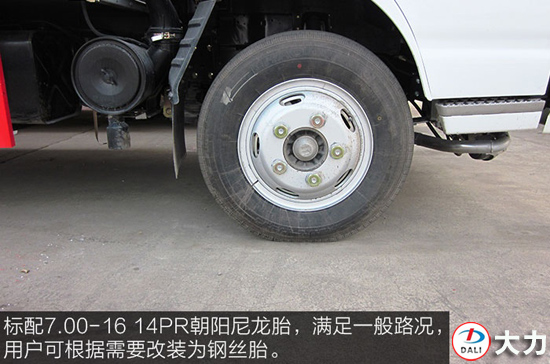 標(biāo)配7.00-16 14PR朝陽尼龍?zhí)ィ瑵M足一般路況,用戶可根據(jù)需要改裝為鋼絲胎。