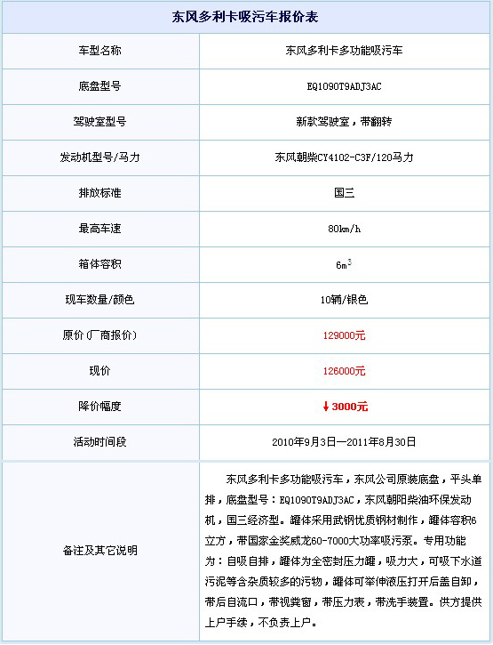 此款多功能吸污車現(xiàn)售價12.6萬元,降價3000元,到2011830之前均可享受折扣,有需要的用戶可以與我公司銷售人員聯(lián)系。