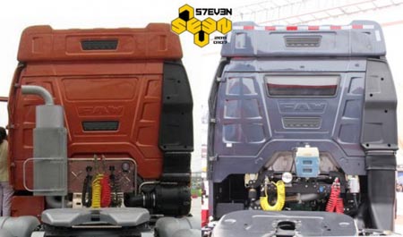 從后面看,J6HC的空濾雖然沒有布置在底盤里或者駕駛室下方,但總體結(jié)構(gòu)比較緊湊。但是J6H不但駕駛室打了補丁,進氣管也打了補丁,硬生生的加長了一截,看起來很怪異。另外膨脹水箱也沒有收納起來,而是外露在駕駛室后圍上,讓人感覺十分遺憾。