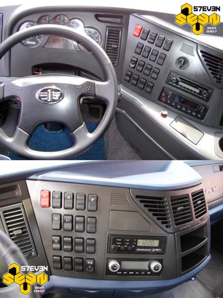 J6HC當(dāng)年的儀表臺是樣件,甚至沒有開皮紋。J6H采用與J6P一樣的儀表臺,雖然套色的結(jié)構(gòu)拜托了中國重卡惡俗的仿桃木習(xí)慣,但藍灰的顏色搭配可能并不是最好的選擇吧。