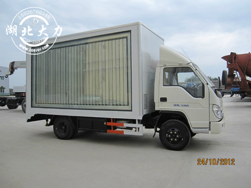 商品展銷車,選用福田底盤,3360軸距,整車長約5.995米,上藍(lán)牌,C照可以開,舞臺(tái)面積18-24平方;為了滿足不同需求的用戶,駕駛室有兩種配置,一種經(jīng)濟(jì)實(shí)惠的窄體駕駛室,另一種是豪華大氣的寬體駕駛室,可以選裝方向助力和空調(diào);側(cè)面展開舞臺(tái)面積在16平方左右,配有舞臺(tái)梯、燈光架、幕布掛鉤及電源箱。