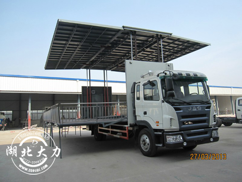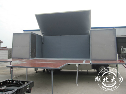 專用裝置:折疊式平臺(tái)、支腿、頂棚 ;專用功能:作業(yè)時(shí)其外側(cè)板和頂板可向上展開升高,內(nèi)側(cè)板向下展開平鋪后, 可形成舞臺(tái)的地板。該車是進(jìn)行舞臺(tái)文藝表演的專用車輛。選裝車門覆蓋件,前圍及前部燈具.選裝前圍及前部燈具,選裝車門覆蓋件,選裝保險(xiǎn)杠,因選裝保險(xiǎn)杠引起前懸加長45。側(cè)防護(hù)采用冷彎型鋼/Q235-A,螺栓連接,后防護(hù)采用冷彎型鋼/Q235-A,焊接連接。后防護(hù)截面高度尺寸100mm, 截面寬度尺寸50mm,下邊緣離地高度400mm。