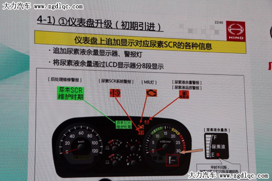 前段時間廣汽日野發(fā)布了其最新的日野700國四車型,該車的尿素液位指示表采用的是獨立布置的數(shù)段式數(shù)字儀表,位于發(fā)動機轉速表的右下方,上有尿素表字樣,便于識別,“F”和“E”分別表示滿與空,在該表的右下側有琥珀色尿素空罐指示燈,該燈平時不閃爍,但是空罐的時候指示燈會顯示琥珀色閃爍,以提醒駕駛員及時添加尿素溶液。此外該車還有尿素SCR系統(tǒng)報警燈和尿素余量/品質(zhì)報警燈。