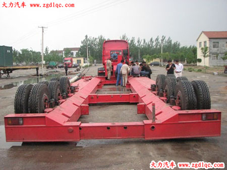 載貨部位的地板為平板結(jié)構(gòu)且無欄板的半掛車,后三橋的凹梁結(jié)構(gòu)也叫高低高,據(jù)說下圖中的這臺車重14噸,保拉100噸集中載荷,梁山某大廠出的。
