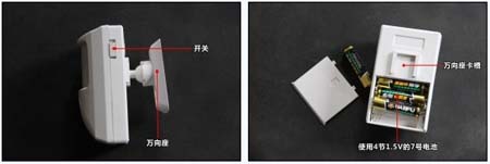 打開外包裝,紅外報(bào)警器的外觀簡潔明了,正面為感應(yīng)區(qū)與喇叭,側(cè)面是開關(guān),后部是萬向座與電池倉。