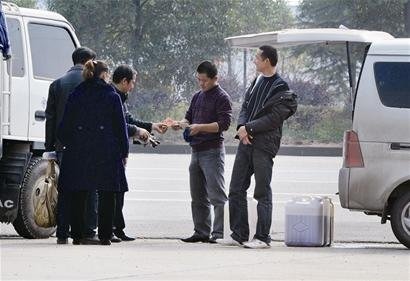 在劉師傅指點下,昨日上午10時許,記者趕到沌口東風大道的三豐加油站,遠遠地就看到加油站掛著“柴油售罄”的告示牌?加油站入口處停著幾輛“流動加油車”——一些面包車車廂內裝有一個500升的大油桶,車旁還有幾個裝滿柴油的塑料油桶依次排開,車主則在一旁叫賣柴油。