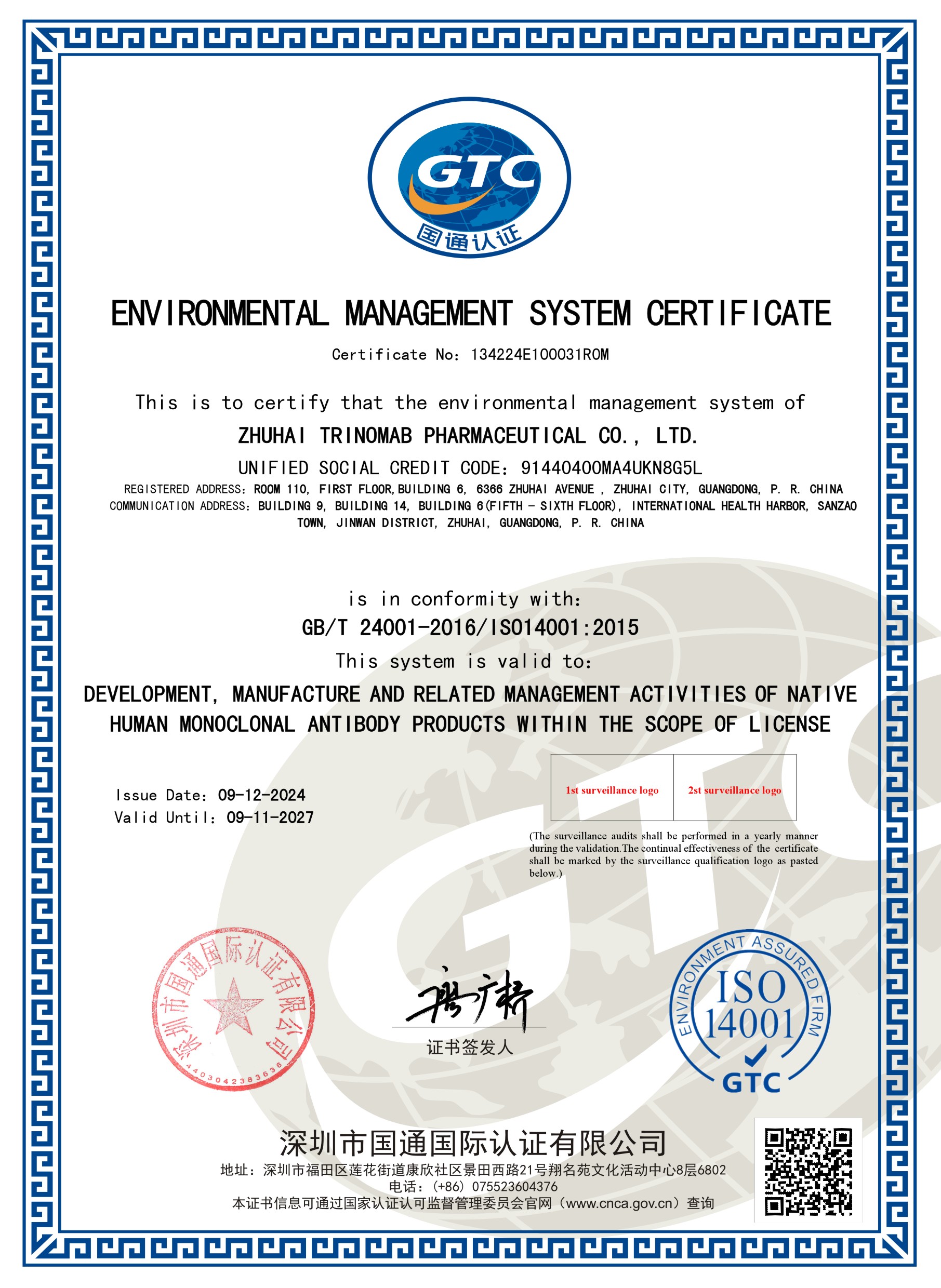 Recently, Zhuhai Trinomab Pharmaceutical Co., Ltd(Trinomab) has successfully obtained two international certificates- the ISO14001 Environmental Management System Certificate and the ISO45001 Occupational Health and Safety Management System Certificate. These certificates signify the international recognition on Trinomab’s high standards on environmental protection and occupational health and safety. It reflects Trinomab's firm commitment to excellence in management in promoting sustainable development and ensuring the health of its employees.