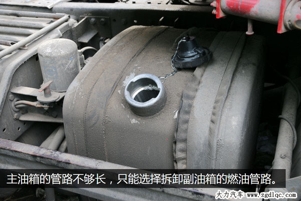 黃師傅的解放J6裝有一大一小兩個(gè)油箱,分為在車架的兩側(cè),一開始我們選擇拆卸主油箱的出油和回油管,但是發(fā)現(xiàn)油管的長度不夠長,所以只能選擇拆卸油管相對(duì)長一點(diǎn)的副油箱油管來進(jìn)行測試。