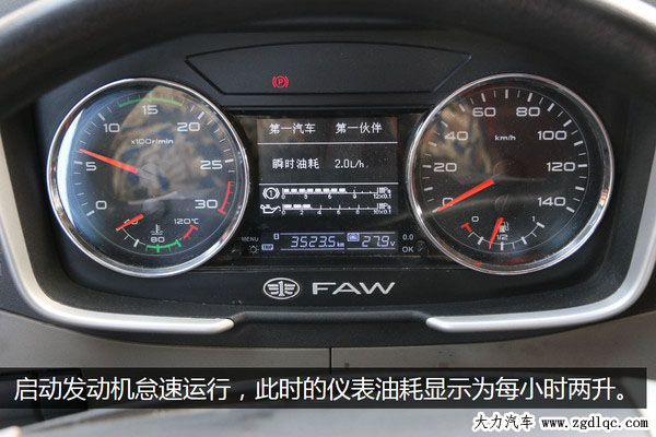 黃師傅的這臺(tái)解放J6裝配的是錫柴6DM2電控發(fā)動(dòng)機(jī),11升排量420馬力,駕駛室內(nèi)的儀表能顯示出發(fā)動(dòng)機(jī)的瞬時(shí)油耗,啟動(dòng)發(fā)動(dòng)機(jī)后發(fā)動(dòng)機(jī)轉(zhuǎn)速穩(wěn)定在650轉(zhuǎn)左右,油耗顯示為每小時(shí)2升,但是電子儀表都有一些誤差,最終的數(shù)據(jù)還要看我們的實(shí)驗(yàn)結(jié)果。