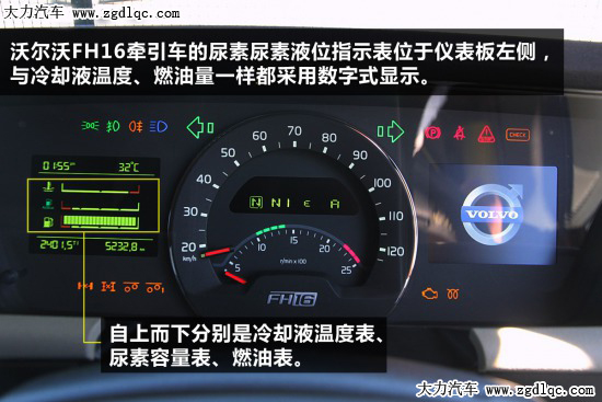 同樣類似風格的尿素容量指示表的形式在沃爾沃FH16牽引車上也出現(xiàn)了,儀表也采用數(shù)段式儀表進行顯示,與冷卻液溫度表和燃油表一起位于儀表盤左側,信息顯示簡介明了。