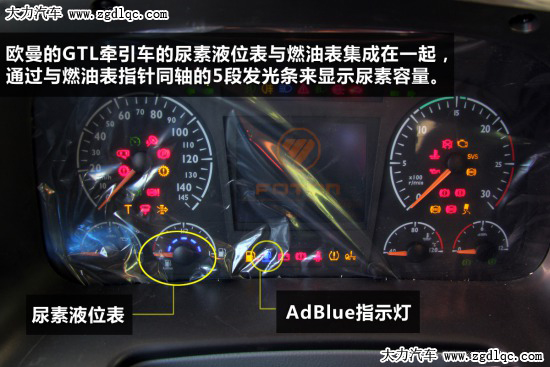 歐曼的GTL牽引車的尿素液位指示表采用數(shù)段式顯示,該表與燃油表集成在一起,燃油量通過指針顯示,尿素液位則通過與燃油表指針同軸的5段發(fā)光條來顯示。同時在該儀表的中部下方還有藍色的ADBLUE指示燈。