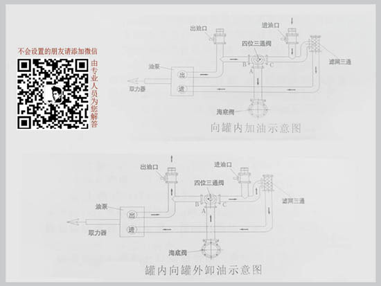 ②當(dāng)你要排油(泵出油)時,油罐車油路是這樣走的:油罐車海底閥→ 四位三通球閥A-C→ 濾網(wǎng)三通→ 進(jìn)入油泵→ 出油泵→ 到出油口→ 出油了。這條油路中以經(jīng)過的環(huán)節(jié),閥門打開,其它閥門關(guān)閉。